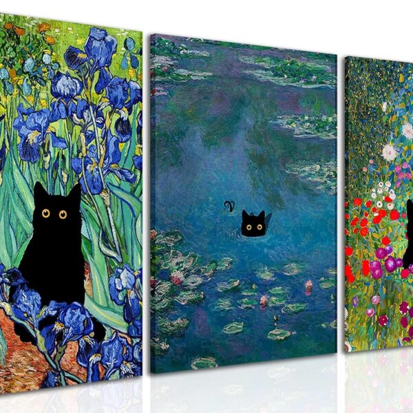 Monet Wall Art Set of 3 – Funny Cat in Water Lilies Canvas Paintings Prints, Garden Flowers Black Cat Aesthetic Pictures for Room Bedroom Living Room Bathroom 12×16 Framed