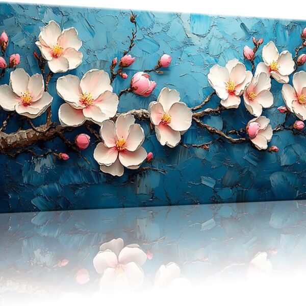 Cherry Blossom Wall Art Canvas, White Flowers on Blue Background, Living room Bedroom Office Modern blue mural Floral Painting Home Decor 20″ x 40″