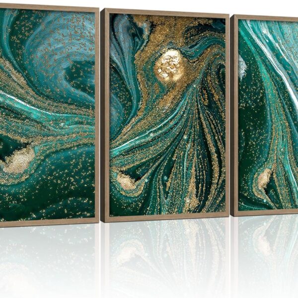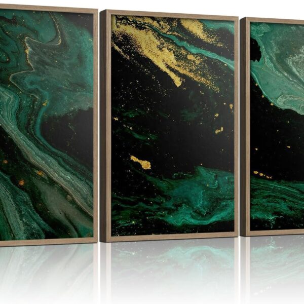 3pcs Wood Framed Green Abstract Canvas Wall Art – Abstract Green Black Gold Fluid Artwork – Modern Green Gold Abstract Prints Posters – Living Room Bedroom Decorative Paintings Gallery Style Wall Hanging Pictures