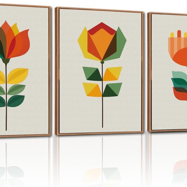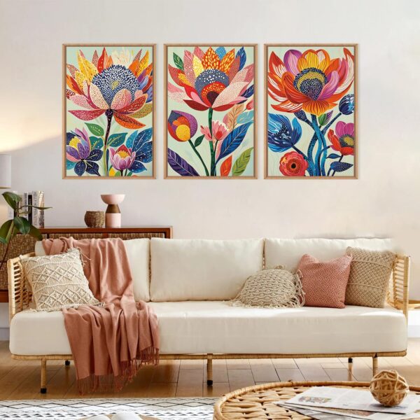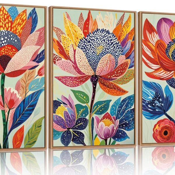 Abstract Botanical Floral Framed Canvas Wall Art Set,Colorful Dot Art Modern Flower Wall Decor,Vibrant Blooming Flowers Artwork Eye-Catching Boho Art Print for Living Room,Bedroom-24 x36 x3